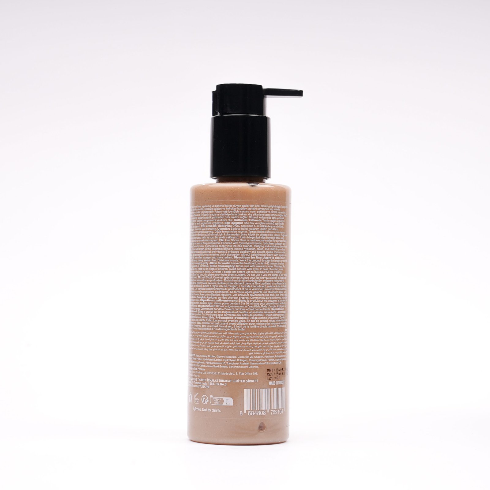 This product is a hair care treatment intended for external use only. It contains effective ingredients such as hydrolyzed keratin, hydrolyzed collagen, argan oil, coffee seed extract, jojoba seed oil, and panthenol, which help moisturize, strengthen, and nourish the hair from roots to ends. It is applied to clean, damp hair, left on for 5 to 10 minutes, then rinsed thoroughly with lukewarm water.
